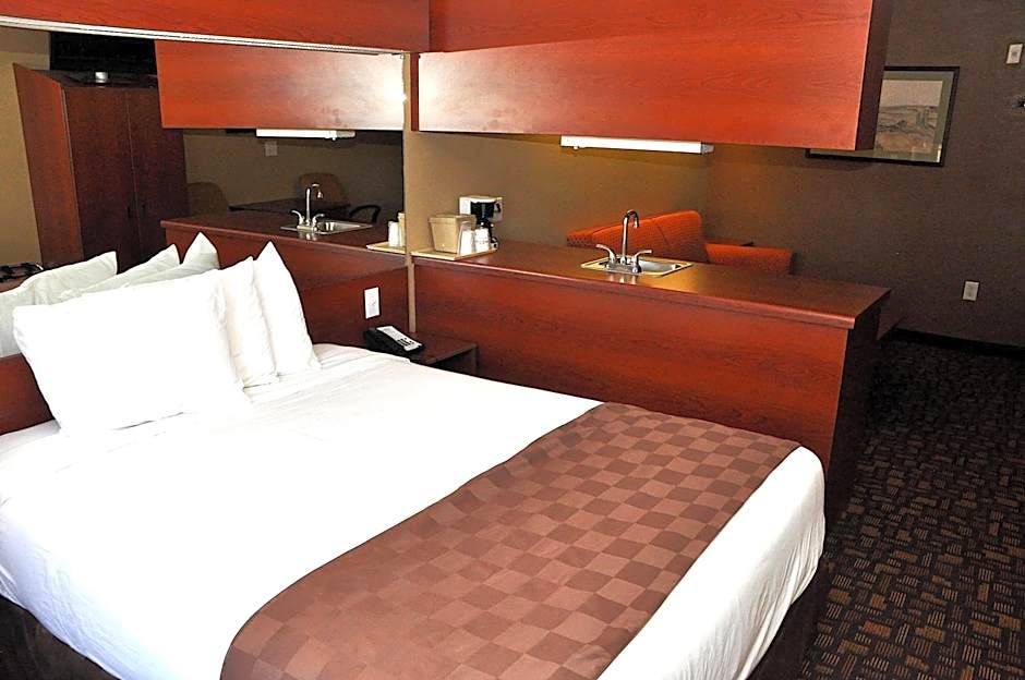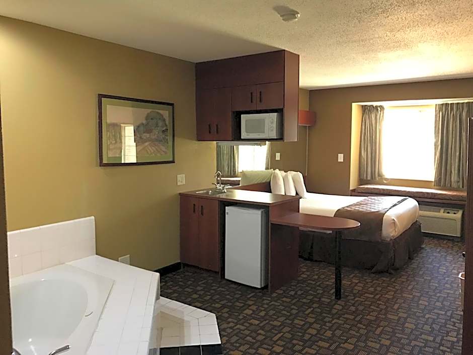 Room features a small refrigerator, microwave, and a work desk.