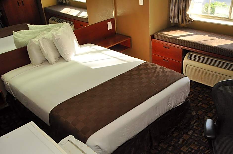 Room features a microwave, small refrigerator and a work desk.